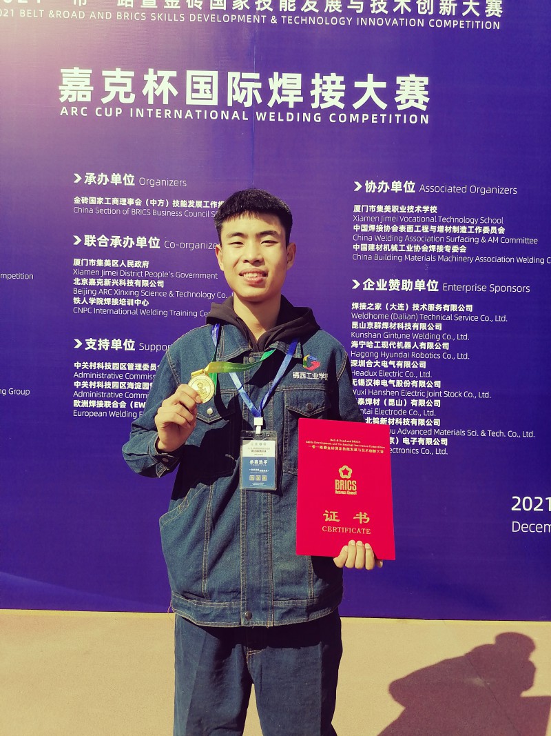 12月3日—8日2021一带一路暨金砖国家技能发展与技术创新大赛之“嘉克杯”国际焊接大赛在福建厦门举行,锦西工业学校学生刘鑫以第一名的成绩荣获院校组焊条电弧焊一等奖;李金、吴战鹏两名同学分别荣获三等奖;王晓光老师荣获金牌教练称号;锦西工业学校荣获团体银奖的好成绩。
